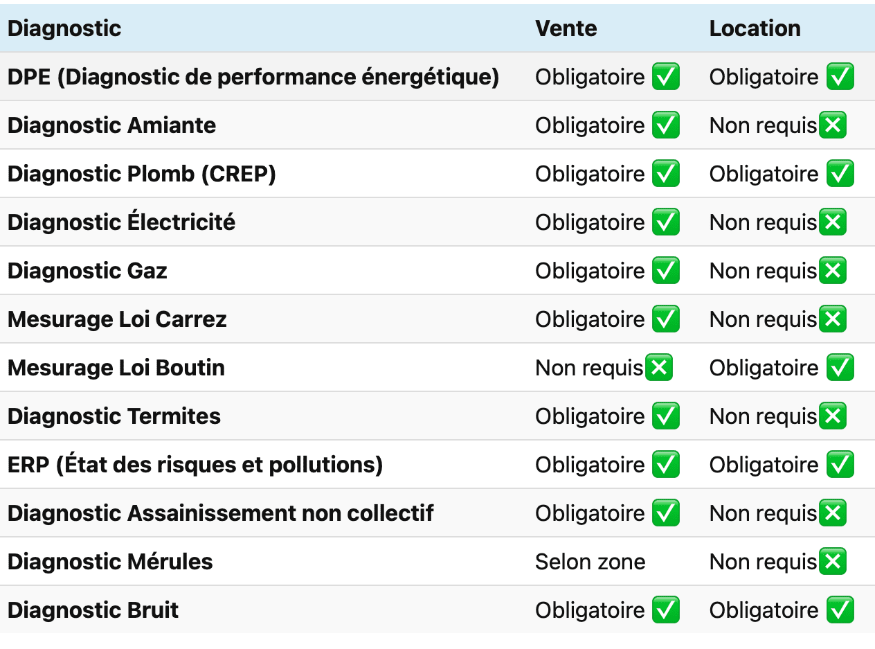 | Diagnostic de Performance Énergétique (DPE) | Toujours obligatoire (sauf exceptions) | 10 ans (si réalisé après le 01/07/2021) |